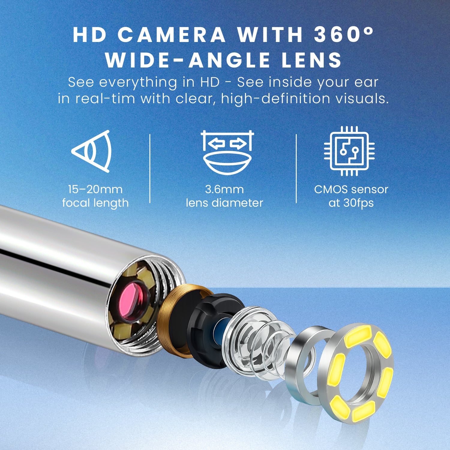 360-DEGREE WIDE-ANGLE VIEW - Get a complete view of your ear canal with the built-in 360° wide-angle lens. This smart ear camera makes ear wax removal more effective by letting you clean from every angle with ease